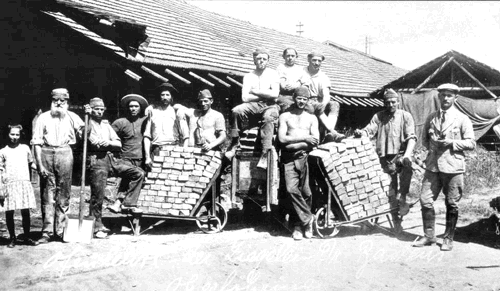 Foto: Ofenleute der Ziegelei Dr. Basten, Oberföhring, Juli 1925. Ganz links: Vinzenz Armellini, Brenner, rechts: Eduard Armellini, Betriebsleiter. © Verein für Stadtteilkultur im Münchner Nordosten e.V.