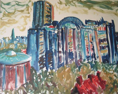 Zwanzig Jahre später malt die Künstlerin noch einmal den Blick aus ihrer Wohnung nach Südosten. Über dem Rundbau von St. Johann von Capistran erkennt man die grüne Baumkirchner Turmspitze. Daneben türmen sich moderne Bürogebäude, in der Bildmitte Giesecke + Devrient. Dahinter erhebt sich das ehemalige Bürohaus des Süddeutschen Verlags am Vogelweideplatz, das bald abgerissen werden soll, um einem Neubau Platz zu machen.