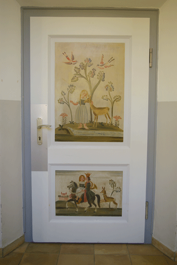 Die Volksschule an der Ostpreußenstraße in Englschalking wurde 1937 von der Stadt München nach Plänen von Hermann Leitentorfer, damaliger Leiter des Stadtbauamts, erbaut. Neben den Handwerkern schafften am Schulhausbau auch Künstler wie die Bildhauer Dorn für die Steinplastik "Erziehung" und Manz für die Tierplastiken über den Nebeneingängen. Der Kunstmaler Demmel schmückte die Türen und Schränke mit Motiven aus Volksmärchen und dem Berufsleben.