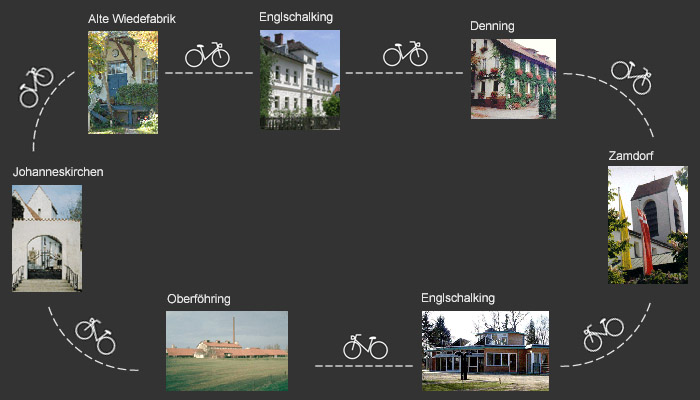 Der Verein für Stadtteilkultur im Münchner Nordosten e. V. lädt zu einer etwa zweistündigen Radtour (ca. 18 km Gesamtlänge) durch das Land der Ziegeleien ein. Wir führen Sie zu sehenswerten Punkten in Englschalking, Denning, Zamdorf, Oberföhring und Johanneskirchen. Dabei streifen wir die alten Dorfkerne und radeln durch viel Grün. Vorgeschlagener Startpunkt ist der alte Dorfkern von Englschalking, die Tour kann jedoch von jeder Station aus begonnen werden. Am vorgeschlagenen Ziel der Fahrt, in der Alten Wiede-Fabrik, gibt es österreichische Weine bei Anton Groiss (freitags ab 17 Uhr).