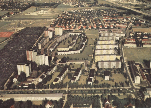 Luftbildaufnahme Parkstadt Bogenhausen (Postkarte 1961); schön zu sehen ist der Innere Ring als "Kern" der Anlage. Unten die Richard-Strauss-Straße. an der linken Seite die Kleingartenanlage NO 3 und NO 17. Am oberen Bildrand links Denning, mit dem Quetschwerk, rechts oben Zamdorf.