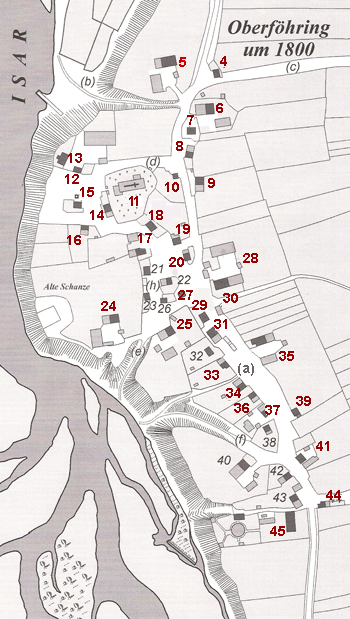 Die interaktive Karte gibt einen Überblick über das alte Oberföhring. Eingetragen sind die Hausnummern von nach 1812 (im Jahr 1856 wurden neue Hausnummern vergeben), die Hausnamen und Verweise auf die heutigen Straßennamen (Buchstaben). Die gestrichelt eingetragene Fläche markiert die Steilkante hinunter zur Isar. Rot markierte Hausnummern bitte für mehr Informationen anklicken!